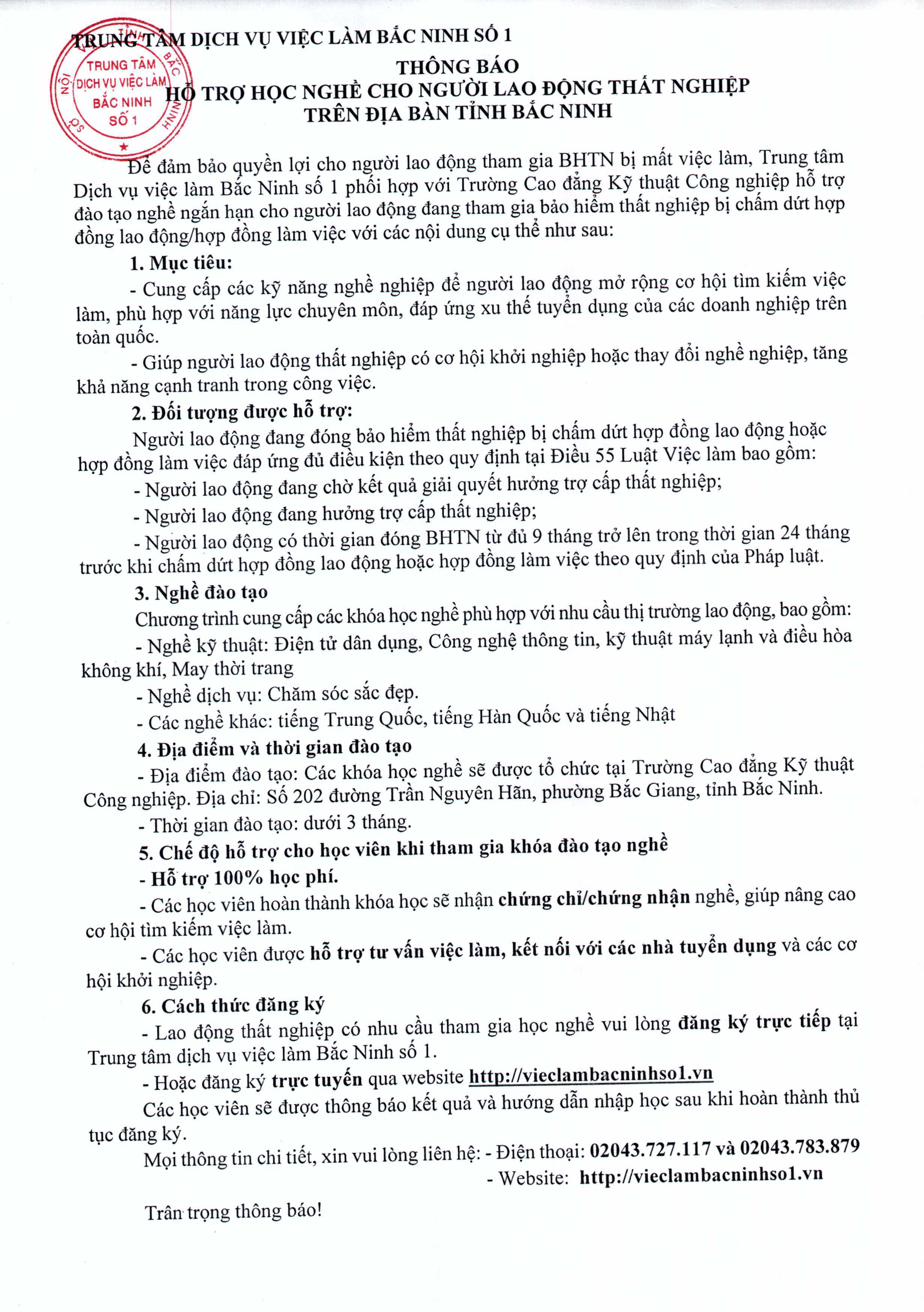 THÔNG BÁO HỖ TRỢ HỌC NGHỀ CHO NGƯỜI LAO ĐỘNG THẤT NGHIỆP TRÊN ĐỊA BÀN TỈNH BẮC NINH